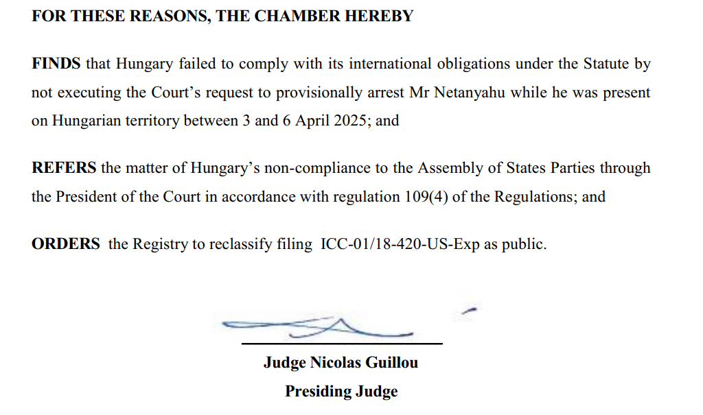 Azt, hogy Magyarország megszegte nemzetközi jogi kötelezettségét, amikor nem tartóztatta le az országba érkező Netanjahut, az ICC is megállapította egy idén júliusban lefolytatott vizsgálat során.