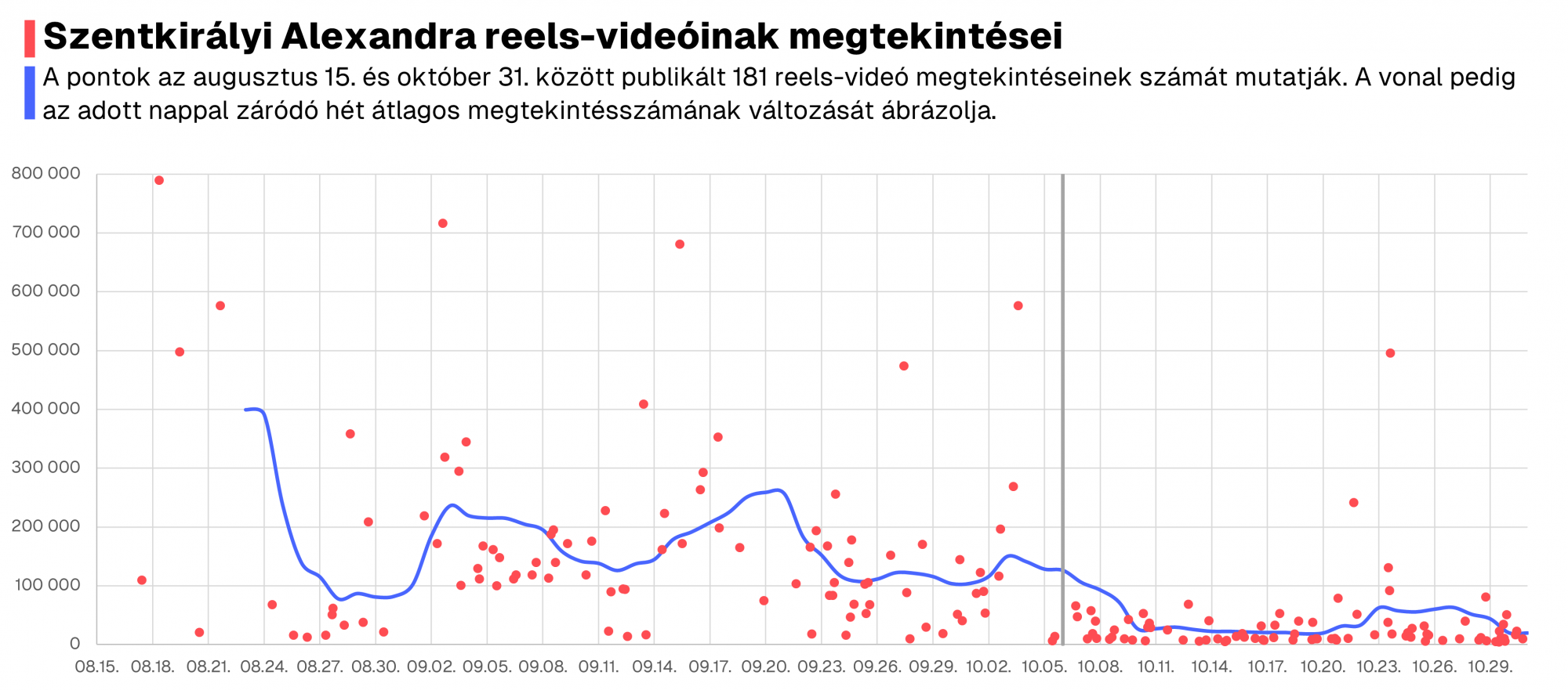 Leginkább Szenktirályi Alexandra videóinak elérése esett vissza október 6. után: ugyan egy békemenetes, 500 ezres megtekintést hozó videóval megközelítette a tiltás előtti időszak legnézettebb tartalmait, ez volt a kivétel. Összességében a videók megtekintései egyértelműen visszaestek.