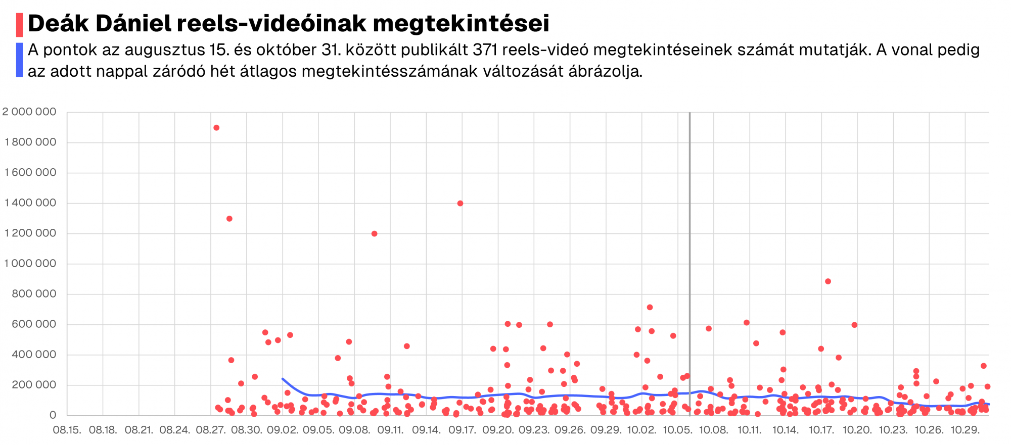 Deák Dánielnél is látunk visszaesést a megtekintésszámokban, de lényegesen kisebb mértékben. Deáknál a kivezetés előtti hetekben 4 videó teljesített 1 200 000 megtekintés fölött, október 6-tól a hó végéig viszont egy videójával sem érte el az egymilliós nézettséget. Október 20. után pedig a korábban még gyakori, 400-800 ezres megtekintésű reelsek is elmaradtak.