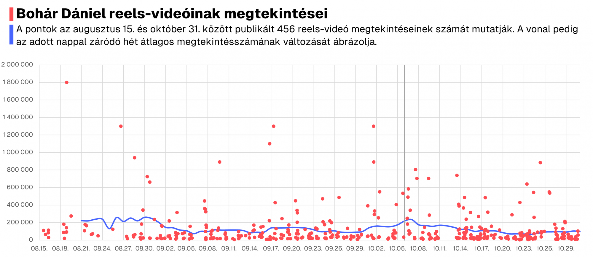 Bohár Dánielnél a kivezetés után eltűnnek a 900 ezer megtekintés fölötti videók, de viszonylag sok ért el 200-800 ezer közötti megtekintést október 6. után is. A videók számának növelése nála ugyanakkor azt is eredményezte, hogy a több alacsony nézettségű reels mérsékelte az átlagot. Így a hónap végére a heti átlagos megtekintés 100 ezer alá süllyedt, ami, ha nem is számottevően, de elmarad a megelőző időszak eredményétől.