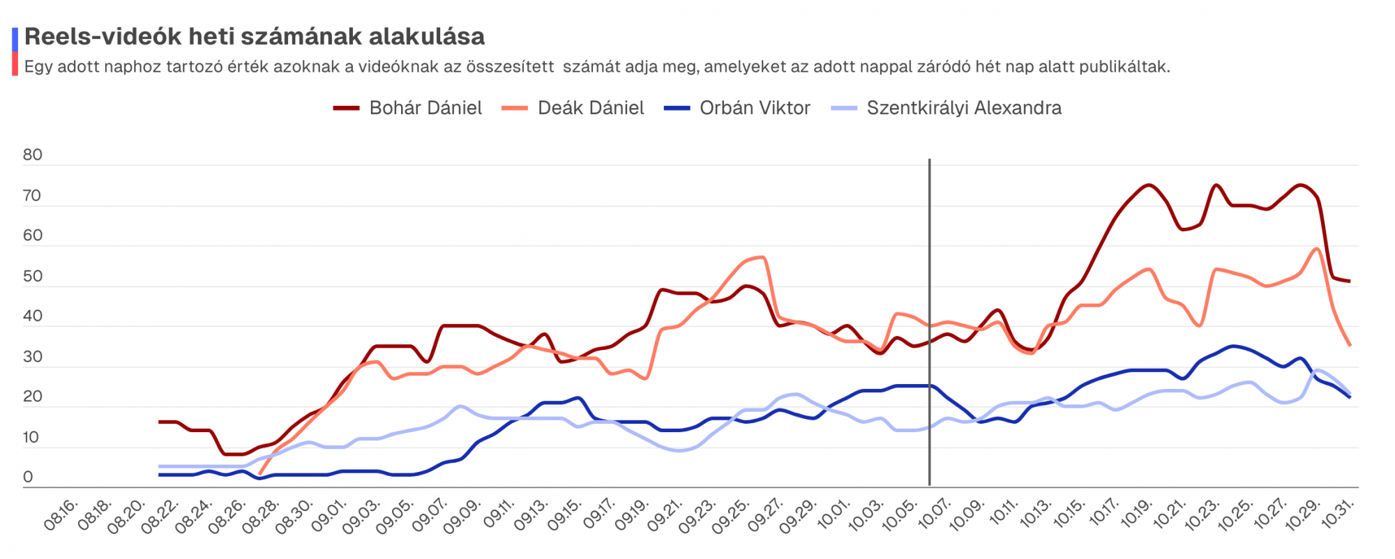 Bohár Dániel a vizsgált az időszakban összesen 456, Deák 371, Orbán 186, Szentkirályi 181 reels-videót közölt.