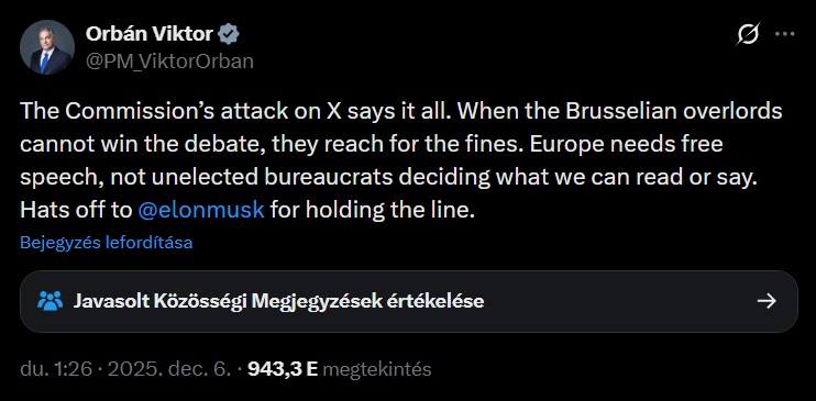 Orbán Viktor ezt a szöveget írta ki angolul X-oldalára december 6-án, miután az Európai Bizottság bejelentette, hogy 120 millió eurós bírságot szab ki az Elon Musk által tulajdonolt és vezetett X-re (korábbi nevén Twitterre) a digitális szolgáltatásokról szóló uniós rendelet (Digital Services Act, DSA) megsértése miatt.