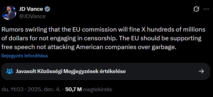 JD Vance alelnök még a bejelentés előtt arról írt, hogy „az EU-nak támogatnia kellene a szólásszabadságot, nem pedig baromságok miatt támadni az amerikai vállalatokat”.
