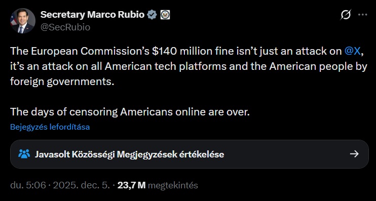 Az amerikai kormány cenzúraként beszél arról, hogy az Európai Bizottság 120 millió euróra büntette az X-et. Orbán Viktor szerint brüsszeli bürokraták akarják eldönteni, mit mondhatunk vagy olvashatunk. Valójában a bizottsági döntés egyáltalán nem foglalkozik azzal, hogy mit posztolnak a felhasználók a közösségi oldalra.