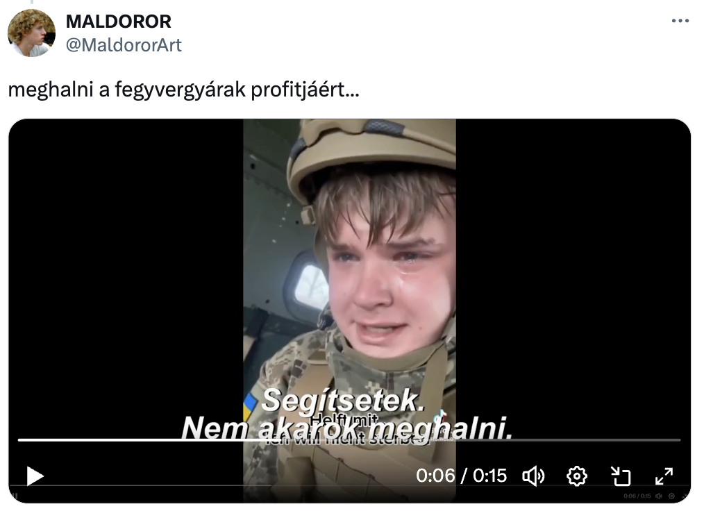 Ez a magyar feliratozás azon a videón (archív) olvasható, amit egy Maldoror nevű profil osztott meg november 3-án az X-en. A megrendítő szavakat a 15 másodperces videón látszólag egy ukrán egyenruhás fiatal katona mondja, könnyek között. A felhasználó kommentárja: „meghalni a fegyvergyárak profitjáért”. A bejegyzést azóta 1,8 milliószor látták.
