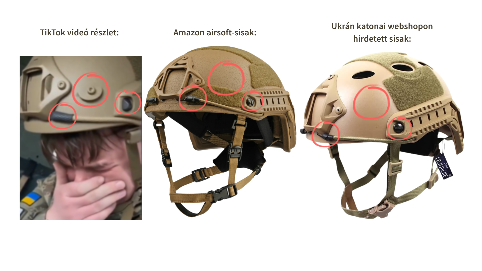Néhány pontatlan részlet is arra utal, hogy AI-generált tartalomról van szó. A videón látható sisaknak a Google fordított képkeresőjével eredtünk nyomába. Találtunk egy airsofthoz használható modellt, de megtaláltuk egy ukrán katonai eszközöket áruló webshopban is. A videón látható sisak mindkét modelltől eltér egy-egy részletében.
