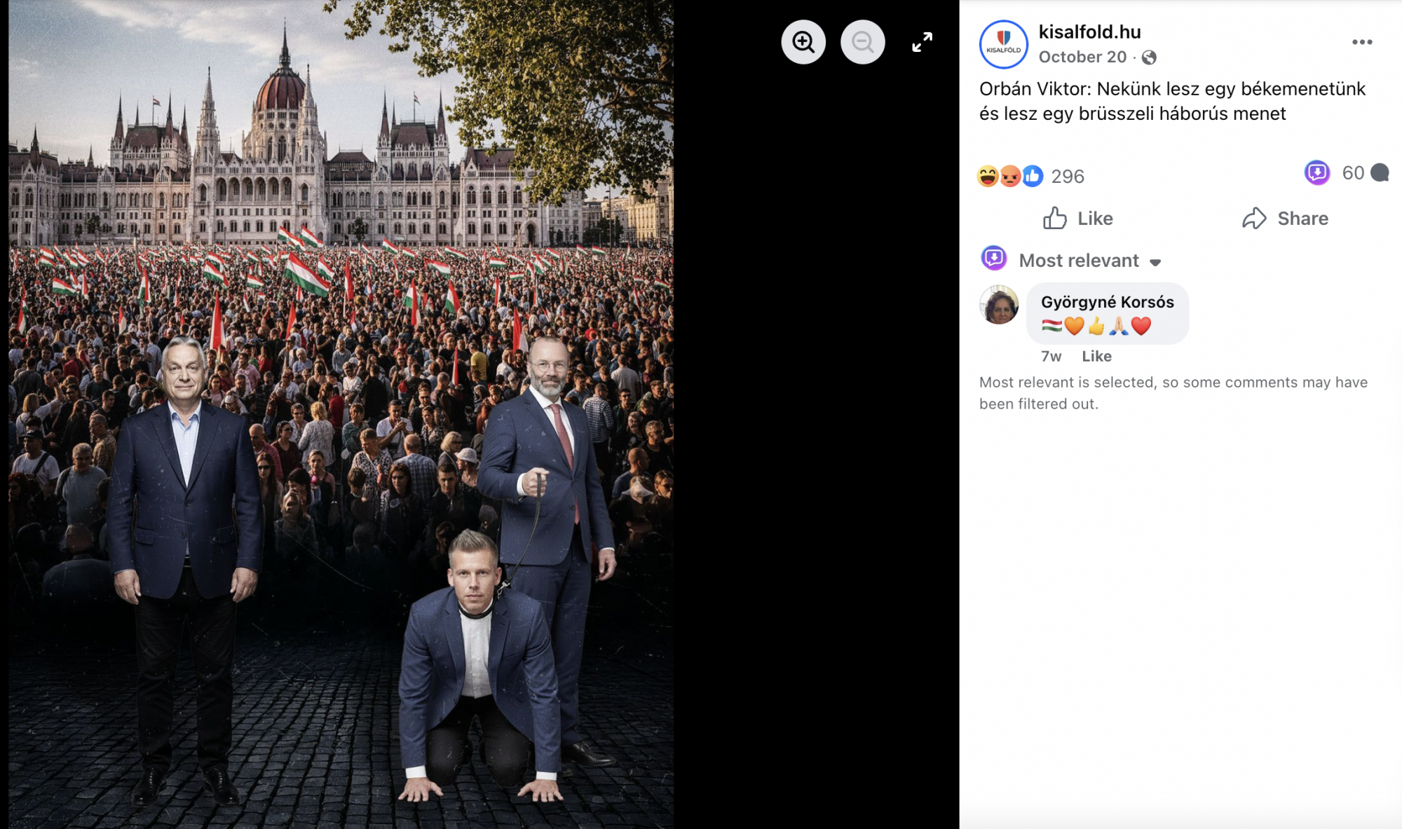 Semmi sem utal arra, hogy a Facebookra feltöltött képhez (amit az „Orbán Viktor: Nekünk lesz egy békementünk és lesz egy brüsszeli háborús menet” felirattal raktak ki) cikk is tartozna. Korábban a 444 még megtalálta az Orbán Facebook-posztjának egyszerű szemléjére mutató linket a hozzászólások között, ám cikkünk írásának időpontjában ez már nem volt elérhető.