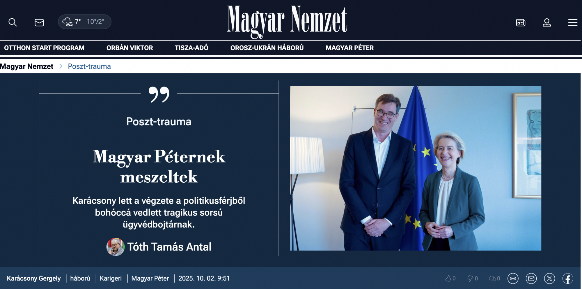 A következő képes tartalomra október 2-ig kellett várni, ekkor tért vissza a Magyar Pétert célkeresztbe állító kampány a „TiSZIA” szlogennel. A képek a Magyar Nemzet egyik véleménycikkét illusztrálták, amelyben a szerző, Tóth Tamás Antal arról elmélkedett, hogyan válthatja le Magyar Pétert Karácsony Gergely, és hogyan kerülhet Magyarország – Brüsszel nyomására – közelebb a háborúhoz. A megyei lapok ekkor egyként búcsúztak el a Tisza Párt elnökétől, még mindig inkább Photoshop-, mint AI-gyanús képekkel.