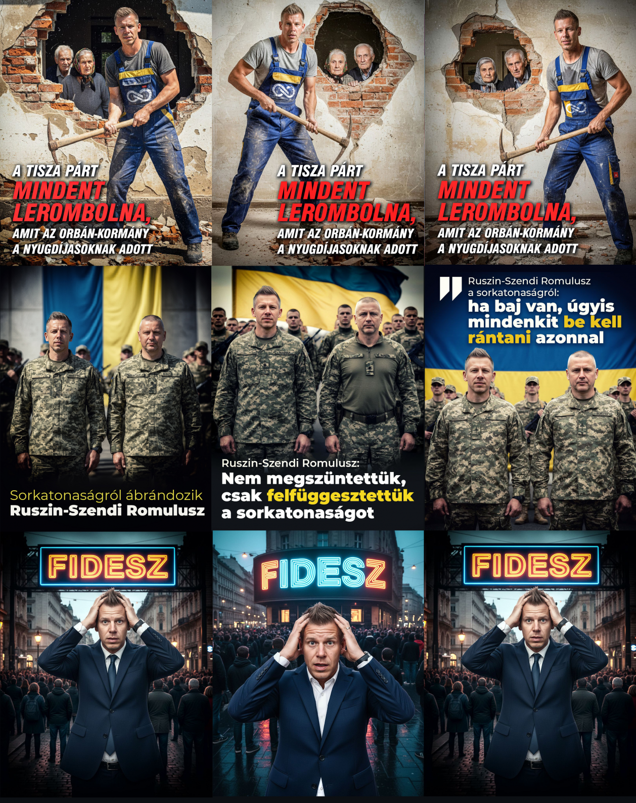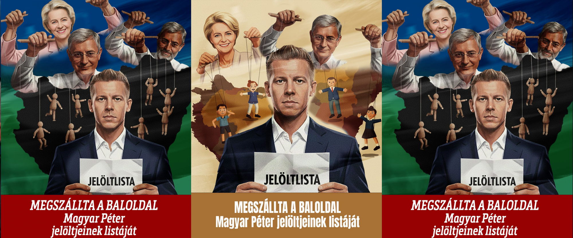 A Tisza Pártot támadó AI slopaganda képek között olyan is van, amin a tiszás jelölteket egyszerre két Gyurcsány rángatja zsinóron, az egyik ráadásul szakállas. A bejegyzések többnyire nem a megyei lapok saját tartalmait népszerűsítik, hanem a Magyar Nemzet cikkeire irányítják az olvasókat.