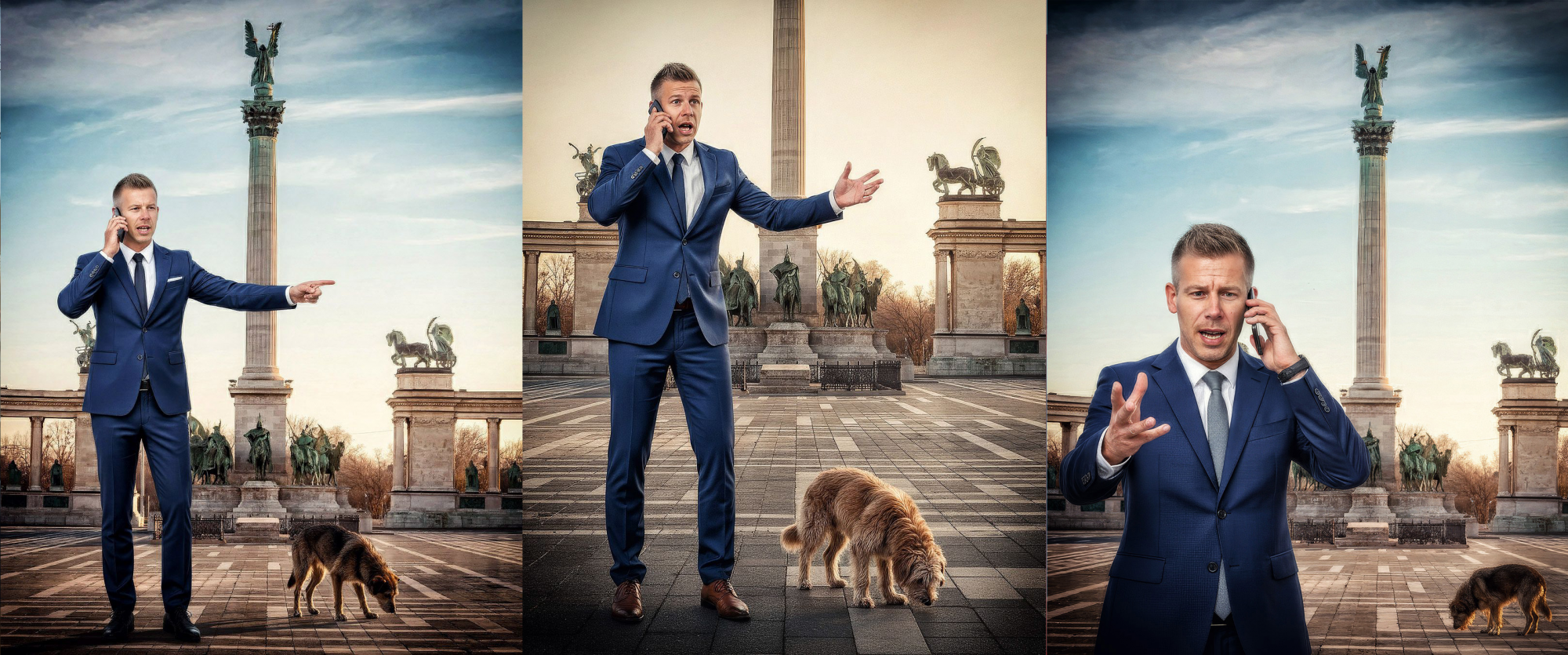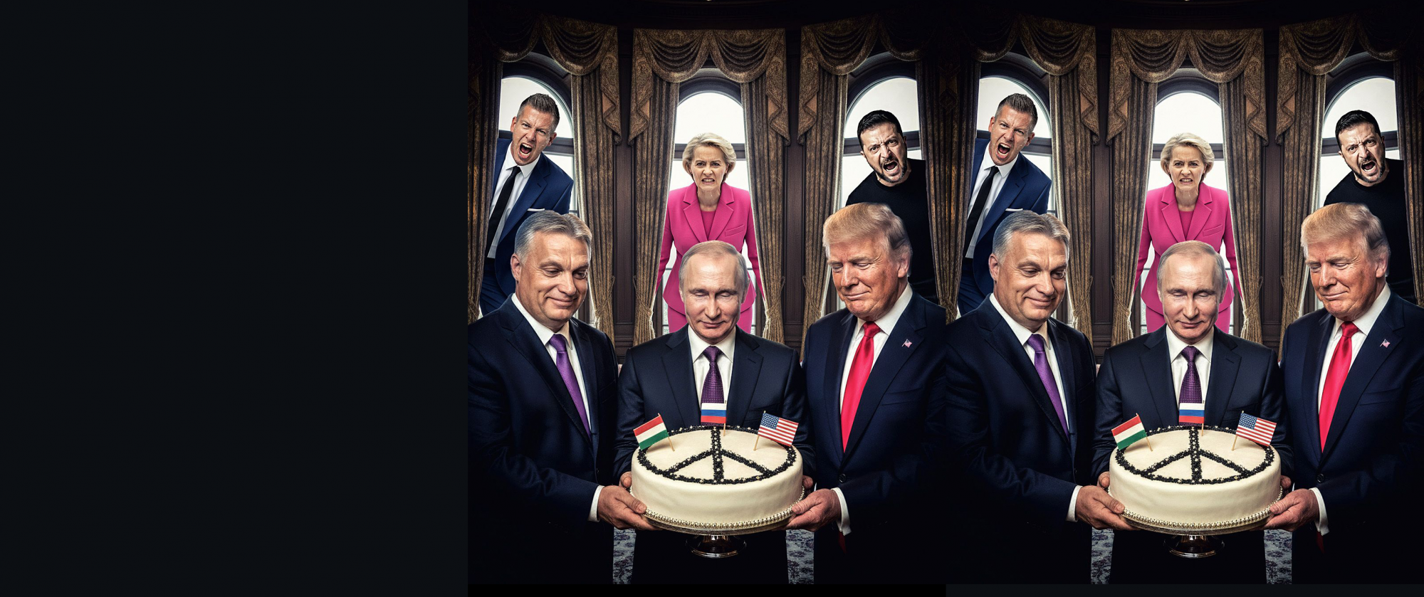 A szinte valósághű ábrázoláson a Tisza Párt elnöke, Magyar Péter mászik négykézlábra ereszkedve, miközben „brüsszeli gazdája”, Manfred Weber, az Európai Néppárt elnöke vezeti őt pórázon. A kompozíció másik felében – éles vizuális kontrasztként – a sármosra és sportosra kreált Orbán Viktor tűnik fel, amint egyedül, magabiztosan áll a nemzeti lobogókkal díszített, zsúfolásig telt Kossuth téren.
