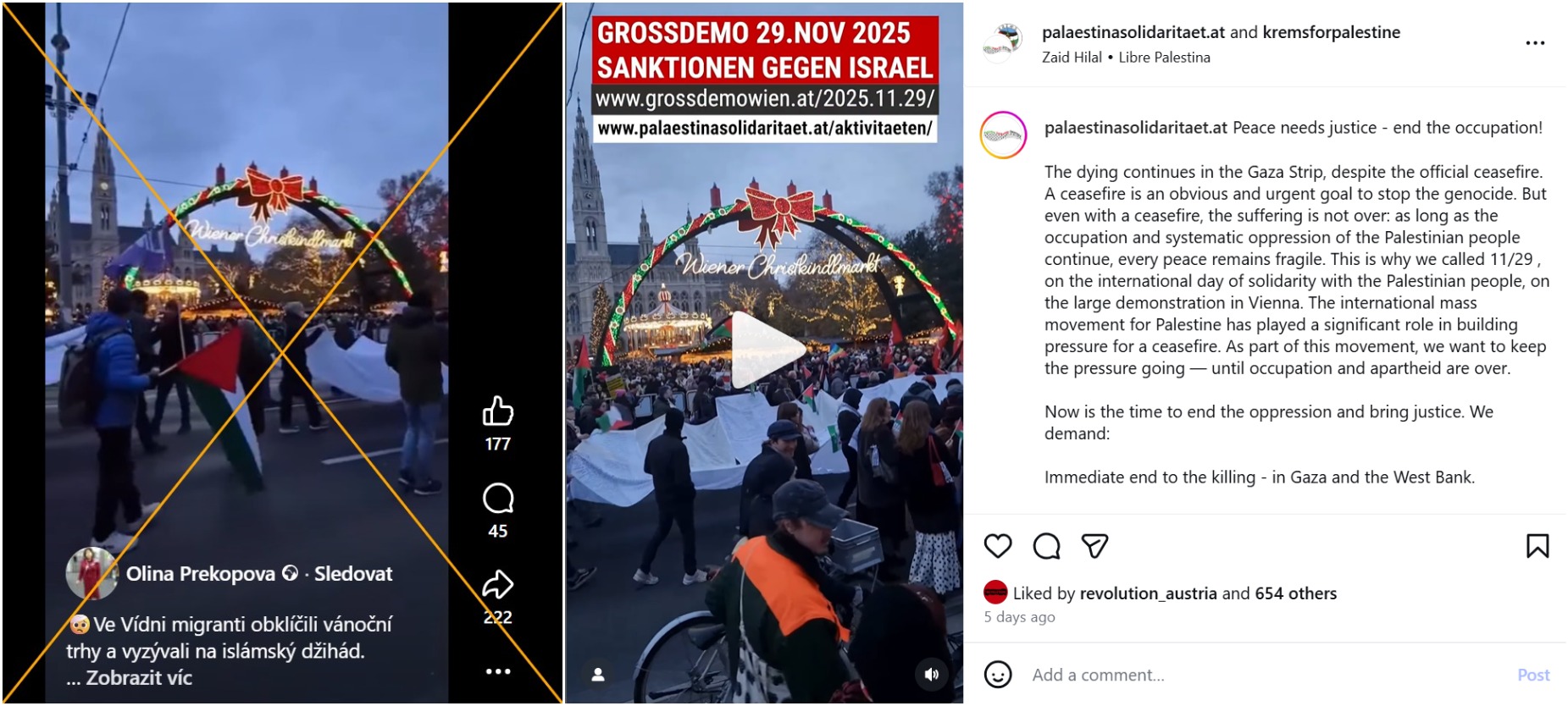 De a jelenleg a közösségi médiában terjedő videó valójában egy 2025. november 29-i, Bécsben tartott palesztinbarát tüntetést mutat. A tüntetők elhaladtak a bécsi karácsonyi vásár bejárata előtt, de nem „vették körül azt”. A szemtanúk és a helyi rendőrség is megerősítette az AFP kérdésére, hogy a vásáron nem történt semmi rendkívüli. Ismeretlenek tényleg kitűztek palesztin zászlókat a Fogadalmi templomra, amit az egyházmegye „politikai cselekménynek” minősített és elítélt.