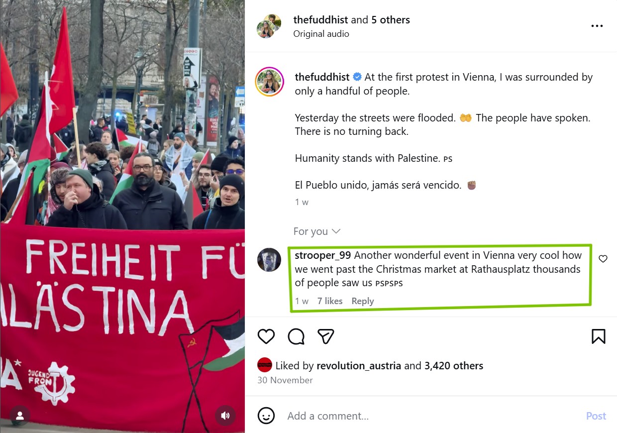 Az Instagram-videó alatt egy felhasználó így emlékezett vissza a piac mellett elhaladó menetre: „Újabb csodálatos esemény Bécsben, nagyon klassz volt, ahogy elhaladtunk a Rathausplatz karácsonyi vásár mellett, és több ezer ember látott minket.” A felhasználó nem válaszolt az AFP által 2025. december 9-én neki küldött kérdésekre.