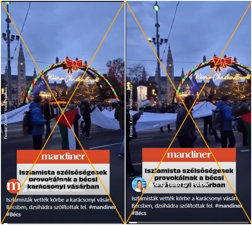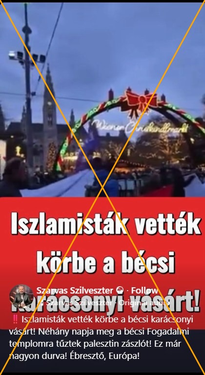 A videóban Szarvas Szilveszter kormánypárti közösségi média-tartalomkészítő és médiaszemélyiség azt mondja: „Iszlamisták vették körbe a bécsi karácsonyi vásárt, megzavarva és provokálva ezzel minket, keresztényeket. Mindez azután történt, hogy a bécsi Fogadalmi Templom két tornyára kitűzték a palesztin zászlót. A szemünk előtt zajlik Európa erőszakos elfoglalása.” A videóban ezután a 19. századi neogótikus bécsi nevezetességre, a Fogadalmi templomra kitűzött palesztin zászlókat látni, majd ismét a tüntetőket.