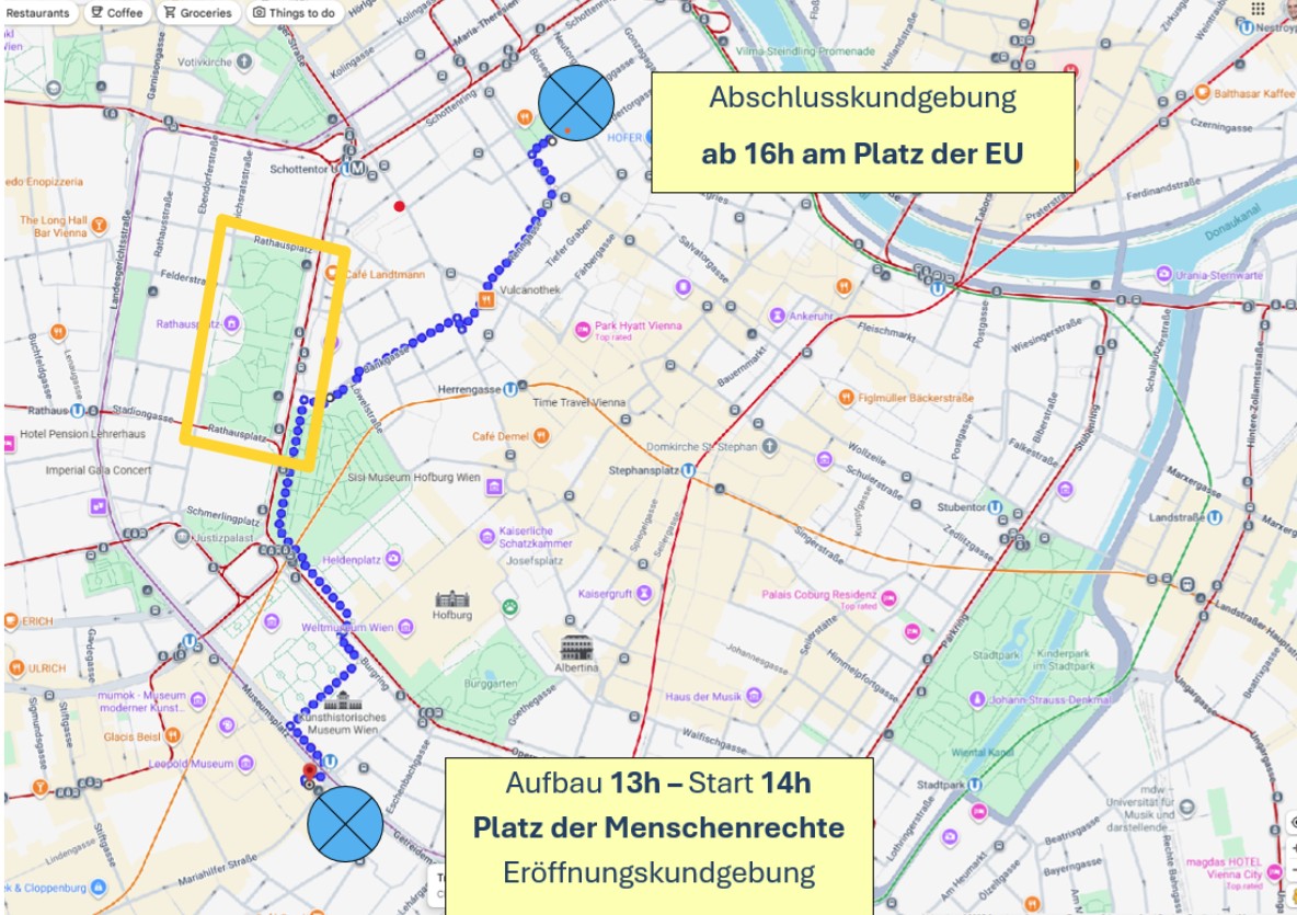 A bécsi rendőrség szerint a tüntetők kissé eltérő útvonalat választottak, és a következő utcákon vonultak céljuk felé: Babenbergerstraße – Burgring – Dr.-Karl-Renner-Ring – Universitätsring – Schottenring. Több intézmény és látnivaló mellett is elhaladtak, köztük a városháza és a karácsonyi vásár mellett.