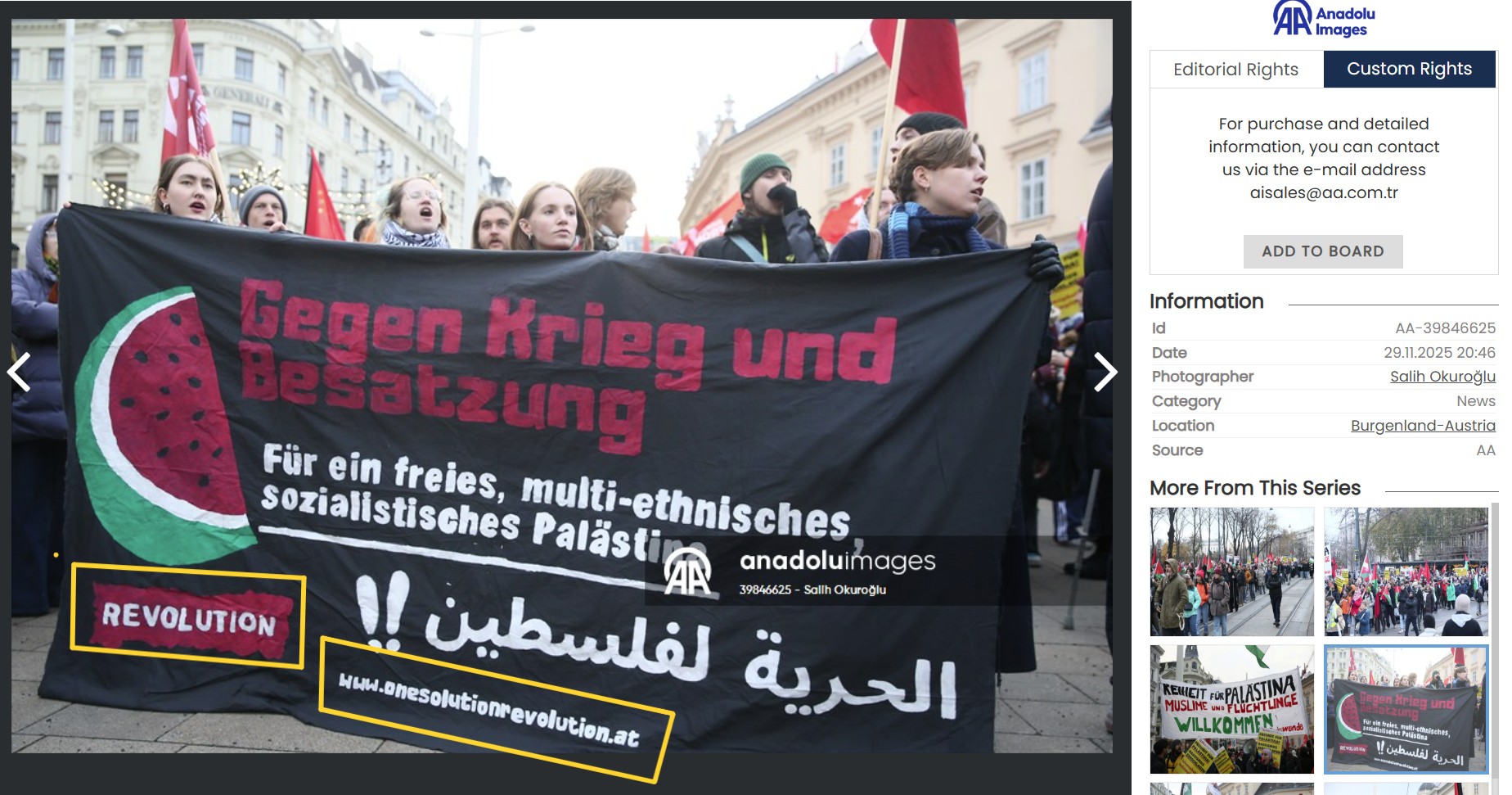 Videók és fotók bizonyítják, hogy egy Revolution nevű csoport csatlakozott a tüntetéshez, amint azt például az alábbi, a török hírügynökség újságírója által készített fénykép is mutatja. A transzparensen látható, hogy a csoport tagjai „szabad, többnemzetiségű, szocialista Palesztinát” követelnek. A csoport nem válaszolt az AFP 2025. december 8-án és 9-én e-mailben és Instagramon küldött kérdéseire.