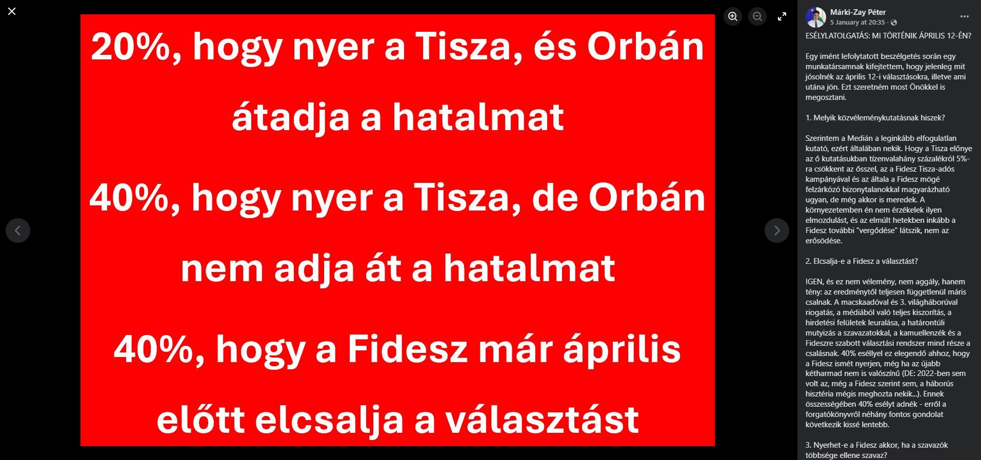 A politikus véleményét egy, a bejegyzéshez csatolt képen foglalta össze, amin ezt írta: "20 százalék, hogy nyer a Tisza, és Orbán átadja a hatalmat. 40 százalék, hogy nyer a Tisza, de Orbán nem adja át a hatalmat. 40 százalék, hogy a Fidesz már április előtt elcsalja a választásokat".