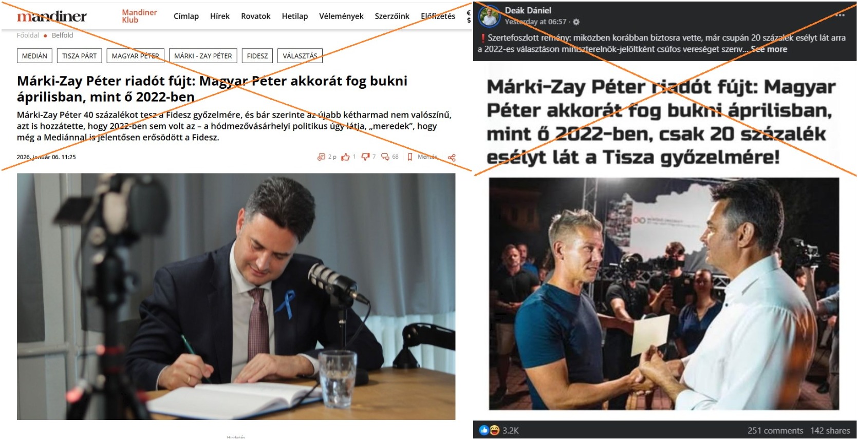 "Márki-Zay Péter riadót fújt: Magyar Péter akkorát fog bukni áprilisban, mint ő 2022-ben" – olvasható a Mandiner kormánypárti hírportál január 6-i cikke. Deák Dániel közösségi média tartalomgyártó szintén elismételte a Mandiner-cikk címét egy Facebook-bejegyzésben, hozzátéve, hogy állítólag Márki-Zay "csak 20 százalék esélyt lát a Tisza győzelmére". Deák bejegyzését több mint 140-szer osztották meg.