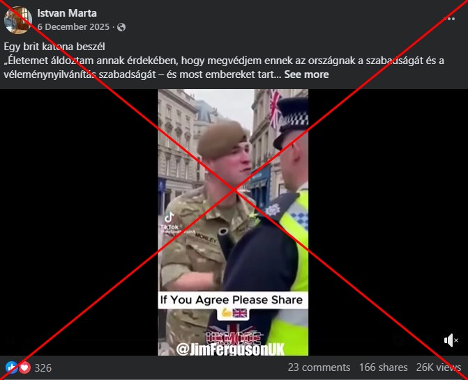 “Egy brit katona beszél” – olvasható egy 2025. december 6-i magyar Facebook-videó leírása, amit már több mint 26 ezren tekintettek meg és 166 felhasználó osztott meg. A videóban egy katonai egyenruhát viselő férfi kiabál egy rendőrrel, és a bejegyzés leírása szerint azt mondja: “Életemet áldoztam annak érdekében, hogy megvédjem ennek az országnak a szabadságát és a véleménynyilvánítás szabadságát – és most embereket tartóztatnak le szavak miatt, miközben szemet hunynak a betolakodók bűnei felett. Önök szégyent hoznak az egyenruhára, és sértés számomra.”