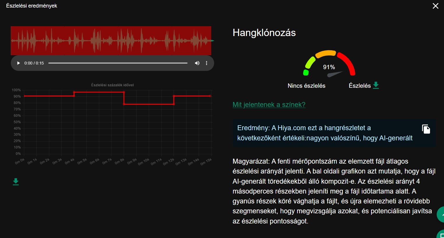 Hasonló eredményt hozott a Deepfake Total nevű, a Fraunhofer Alkalmazott és Integrált Biztonsági Intézet által kifejlesztett, AI által generált hangsávok felismerésére szolgáló alkalmazás is. Ez 99,9 százalékos valószínűséggel állapította meg, hogy a hangsáv AI által generált.