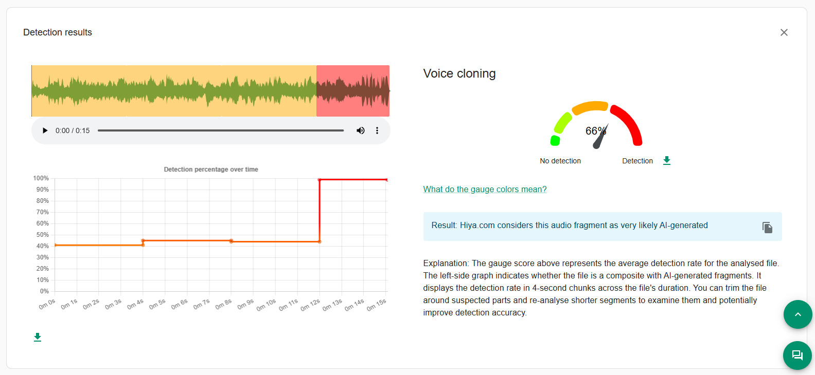 A videó hanganyagát is elemeztük az InVID WeVerify program Hiya funkciójával. A Hiya 66%-os valószínűséggel állapította meg, hogy a videó hanganyaga mesterséges intelligencia által generált lehet, ami ebben az esetben egy magas arány, mivel egy eredeti hangsáv esetében ennek a számnak a nulla közelében kell lennie.