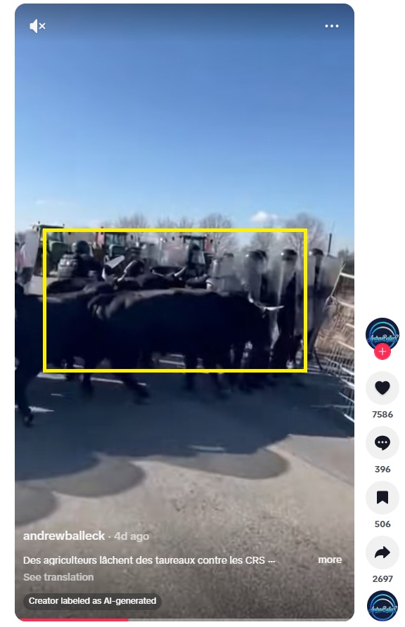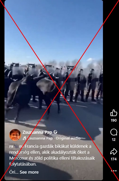 “Francia gazdák bikákat küldenek a rendőrség ellen, akik akadályozták őket a Mercosur és zöld politika elleni tiltakozásaik folytatásában” – olvasható egy magyar Facebook-videó címe, ami már több mint 174 megosztást és 17 ezer lejátszást ért el.