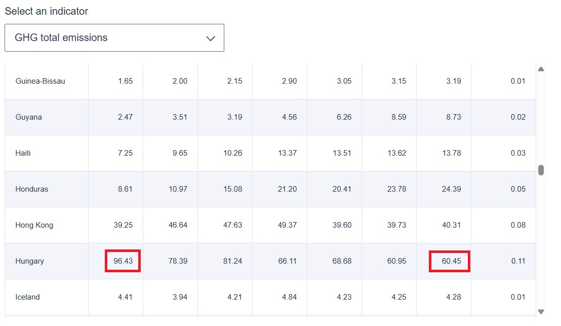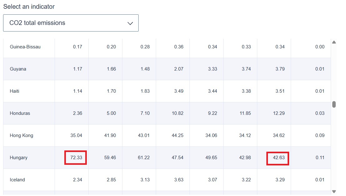 Az EDGAR adatbázis szerint 1990-ben 72,33 millió tonna szén-dioxidot bocsátottak ki Magyarországon, 2024-ben pedig 42,63 tonnát, a csökkenés tehát nagyjából 41 százalékos.