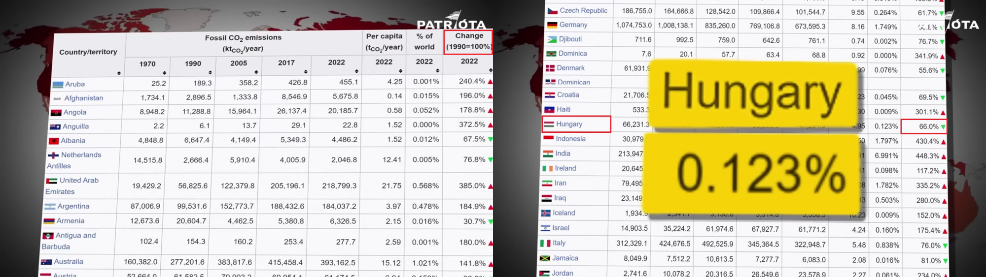 Tóth Máté videójában a „több mint kétharmadával csökkent” szövegrész alatt egy Wikipedia-oldalról származó táblázatot vágnak be, ami az egyes országok széndioxid-kibocsátását mutatja különböző években. A kérdéses Wikipedia-oldalt nem találtuk meg, de az a videón bevágott részekből is kiderül, hogy a táblázat utolsó oszlopa az 1990 és 2022 közötti kibocsátáscsökkenést mutatja, az oszlop tetején ugyanis az a megjelölés szerepel, hogy „Change (1990=100%)”.