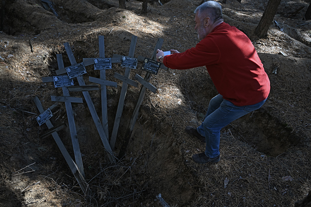 A film egyik legerősebb jelenetében a szereplők egy fenyőerdőben sétálnak libasorban – vigyázva a lehetséges taposóaknákra – Izium város közelében, ami 2022-ben közel fél évig orosz megszállás alatt állt. Bucsa mellett itt követték el az oroszok az eddigi legsúlyosabb háborús bűnöket. Az erdőben nagy gödrök vannak, felásott tömegsírok, amelyekbe a megszállás alatt bombázások, éheztetés vagy megtorlás útján meggyilkolt több mint 20 katonát és 400 civilt temették az oroszok. Több áldozat testén kínzásra utaló jeleket találtak a hatóságok.