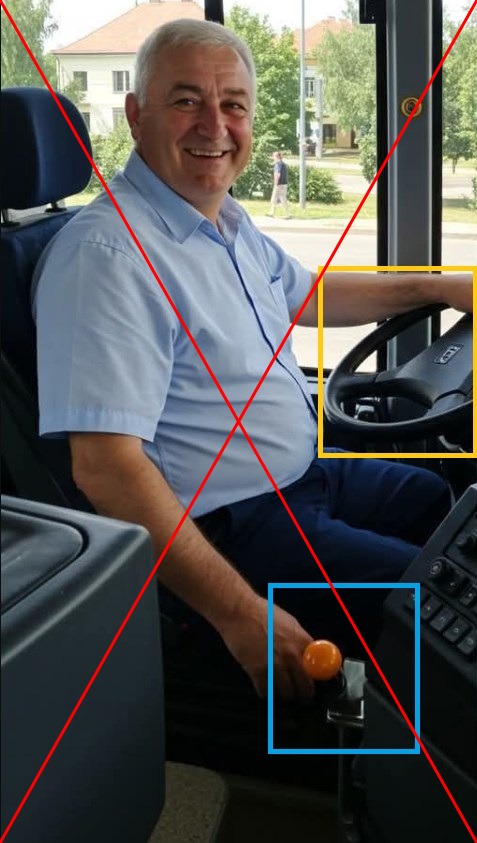 Az első képen az állítólagos sofőr egy olyan kormány mögött ül, amelyen egy logó látható, amely általában a jármű gyártóját jelzi. A logó azonban nem egyezik meg egyetlen Szegeden használ busz (Volvo, Credobus, Mercedes, Scania, MAN, ésBYD) logójával sem.