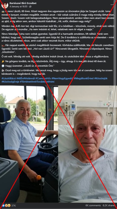Az AFP nem talált megbízható forrásból származó információt arról, hogy a történetben leírtaknak megfelelően egy buszsofőr rosszul lett volna munka közben Szegeden. Egy szegedi online újság 2026. január 8-án pont olyan cikket tett közzé, miszerint a közösségi médiában keringő történet hamis.