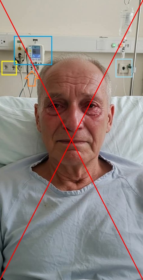 A képen az elektromos aljzatok három csatlakozóval rendelkeznek, ami Észak-Amerikában jellemző, az EU-országokban viszont nem. Az egyik csatlakozó ovális és torz. Az egyik falra akasztott eszköz több kábellel van összekötve látszólag lehetetlen módon; a másik eszköz, amely valamennyire hasonlít egy betegellenőrző monitorra, nem jelenít meg tényleges adatokat.