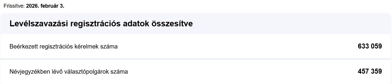 Az NVI adatai szerint 2026. február 3-án 457 359 külhoni választópolgár szerepelt a levélben szavazók névjegyzékében, a „beérkezett regisztrációs kérelmek száma” pedig 633 059 volt.