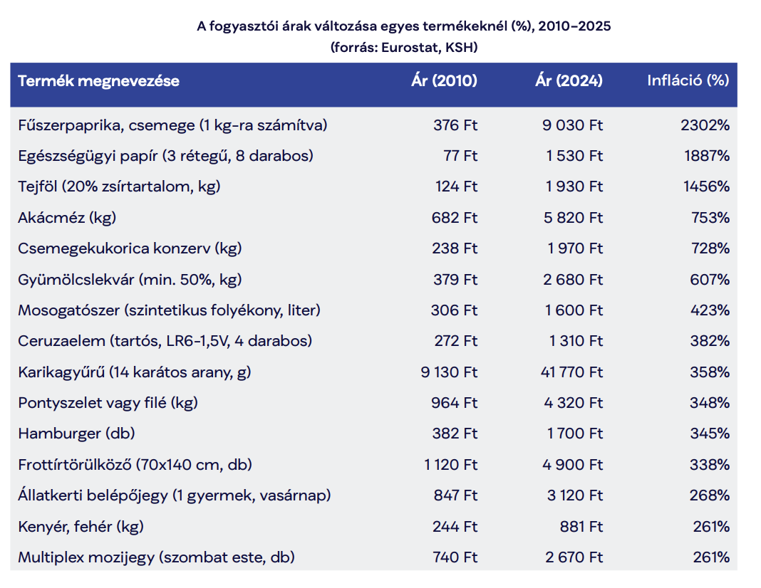 Szemléltetésként közölnek egy 15 tételből álló táblázatot, ami egyes termékek fogyasztói árának változását mutatja 2010 és 2024 között – itt szerepel a tejföl és például a fűszerpaprika is, mint extrém módon megdrágult termékek.