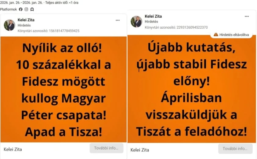 Kelei's most recent advertised post appeared on January 26, summarizing the results of a survey conducted by a Hungarian research institute called Magyar Társadalomkutató. A similar post published on January 20 also referred to the results of a poll predicting a Fidesz victory, but Meta identified it as a political advertisement and removed it.