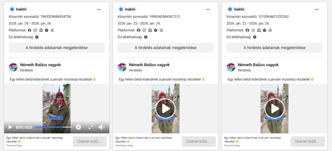 Balázs Németh is advertising the same content on multiple platforms and in multiple versions: he advertised his video about the January utility bill freeze in three versions on five Meta platforms.