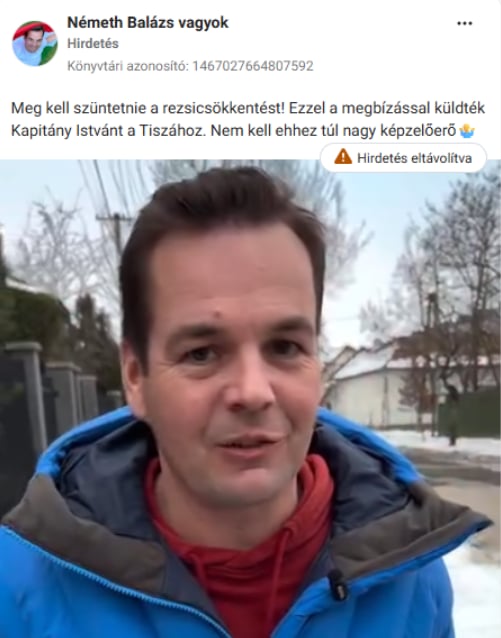 We only need to go back two days in time to see his most recent ad, which was removed by Meta. In the removed ad from January 24, Németh talks in a video about István Kapitány, who was recently introduced as the opposition Tisza Party's leading expert on economic development and energy.