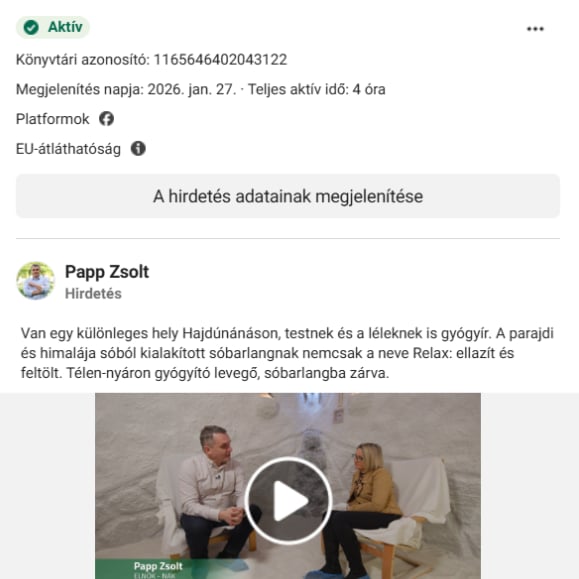 Political Capital identified 24 political advertisement on his account, and Papp has continued to advertise since then. In his most recent post, for example, he presented a salt cave made of Parajd and Himalayan salt, located in the Hungarian city of Hajdúnánás.