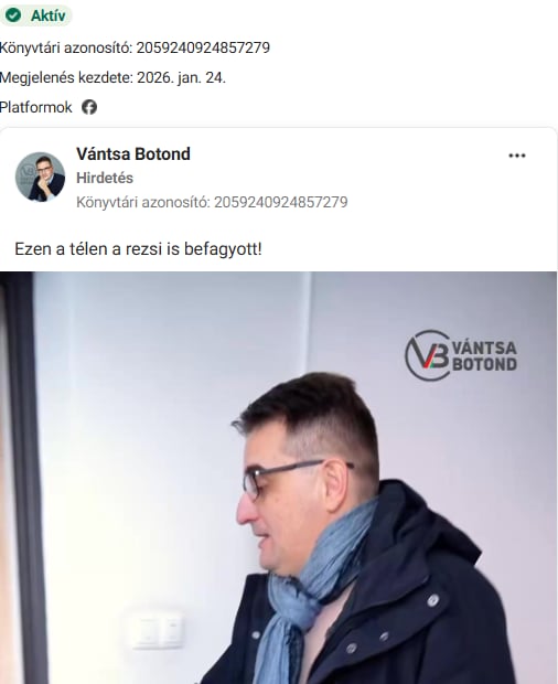 Political Capital found a total of 22 paid posts by Botond Vántsa that ran uninterrupted during the reviewed January period. On Tuesday, January 27, we found four active ads by him in the ad library.