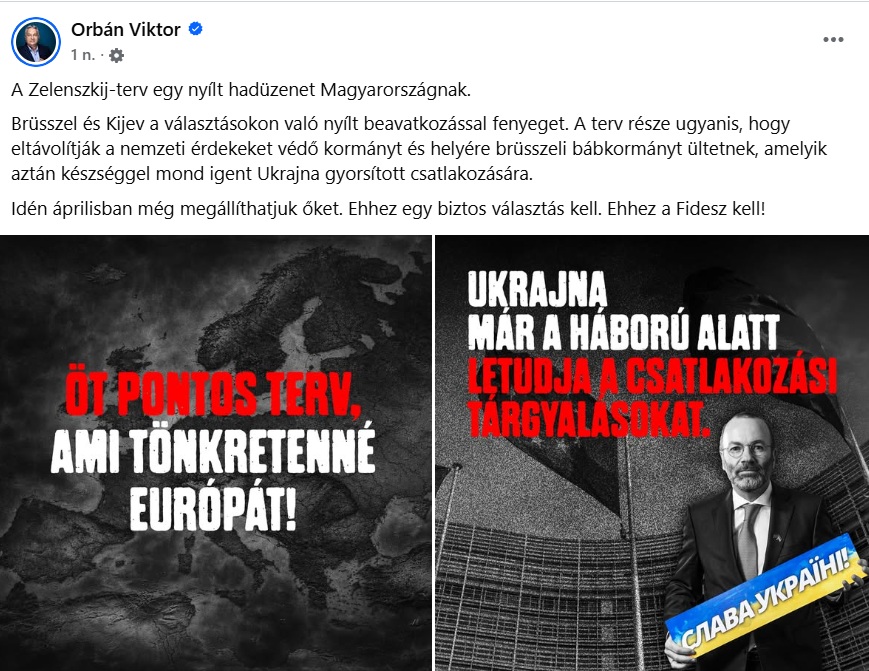Pár órával később, egy újabb posztban Orbán már „hadüzenetként” értelmezte a „tervet”, és azt írta, „Brüsszel és Kijev a választásokon való nyílt beavatkozással fenyeget”. Orbán bejegyzésének a terv pontjait részletező egyik illusztrációján az áll: „megbuktatják a nemzeti kormányt Magyarországon, és a helyére léptetik a Tisza Pártot, akik támogatják Zelenszkij tervét”.