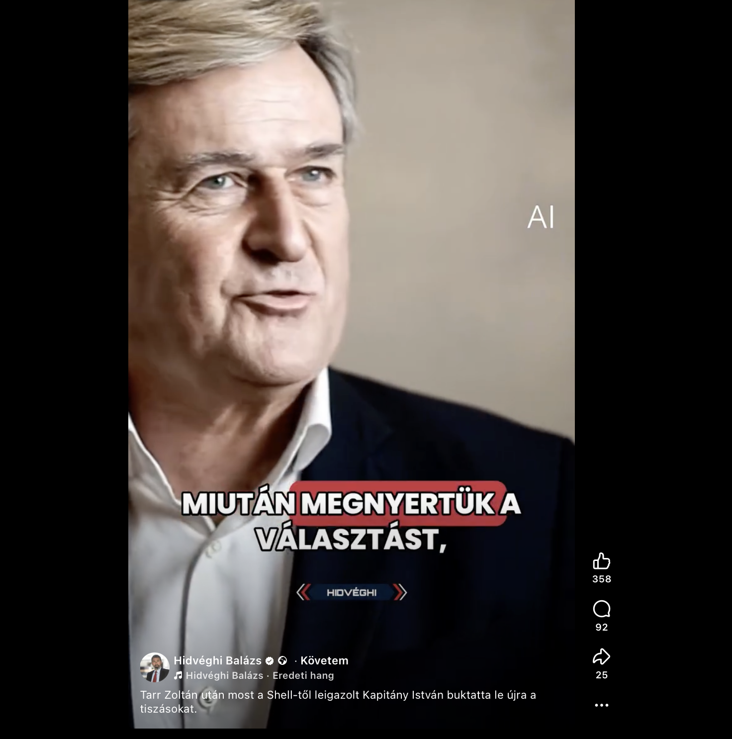 Néhány órával később Hidvéghi Balázs oldalán már egy AI-jal generált Kapitány István a saját AI-hangmásán mondta el a szóban forgó mondatot. Bár a leírás vagy a kommentár nem utal arra, hogy nem valódi felvételről van szó, a videó jobb oldalán jól látható az AI-felirat. Hidvéghi kommentárja szerint Kapitány ezzel a mondattal lebuktatta a tiszásokat – vagyis elszólta magát, és bevallotta, hogy a Tisza titkolózik.