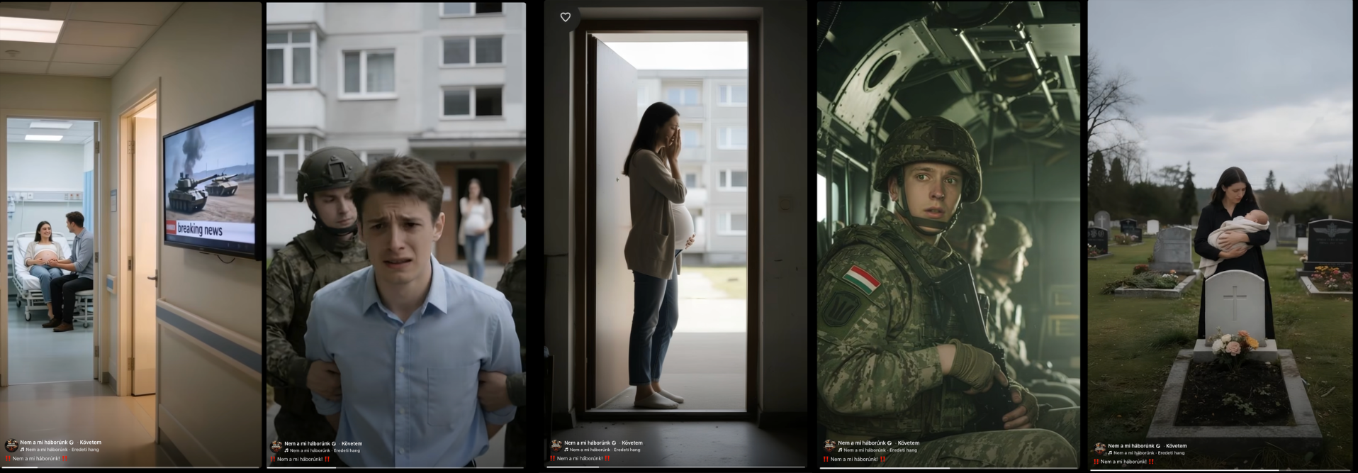 A legfrissebb, egy frontról visszatérő rokkant katonáról szóló videója végén pedig ugyanazt a szlogent használja a Nem a mi háborúnk oldal, mint ami a Fidesz Budapest AI-videójában is elhangzott.