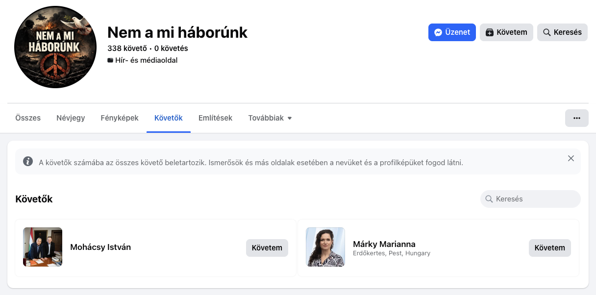 A Meta nem engedi, hogy az oldal mind a 338 követőjét végigböngésszük, amikor megnyitjuk a követők fület, két ember neve nyilvános: Mohácsy Istváné és Márky Mariannáé.