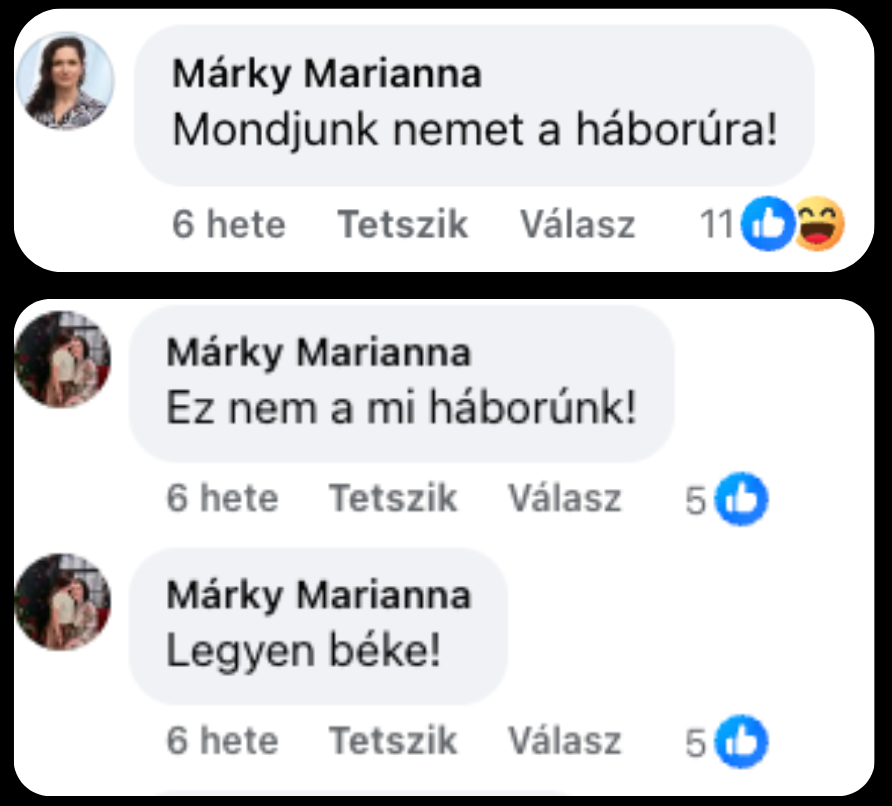 Az oldal követése mellett Márky az első videó alatt három kommentet is írt, egyet a hivatalos Facebook-oldaláról, kettőt a magán profiljáról, és meg is osztotta a Nem a mi háborúnk videóját.