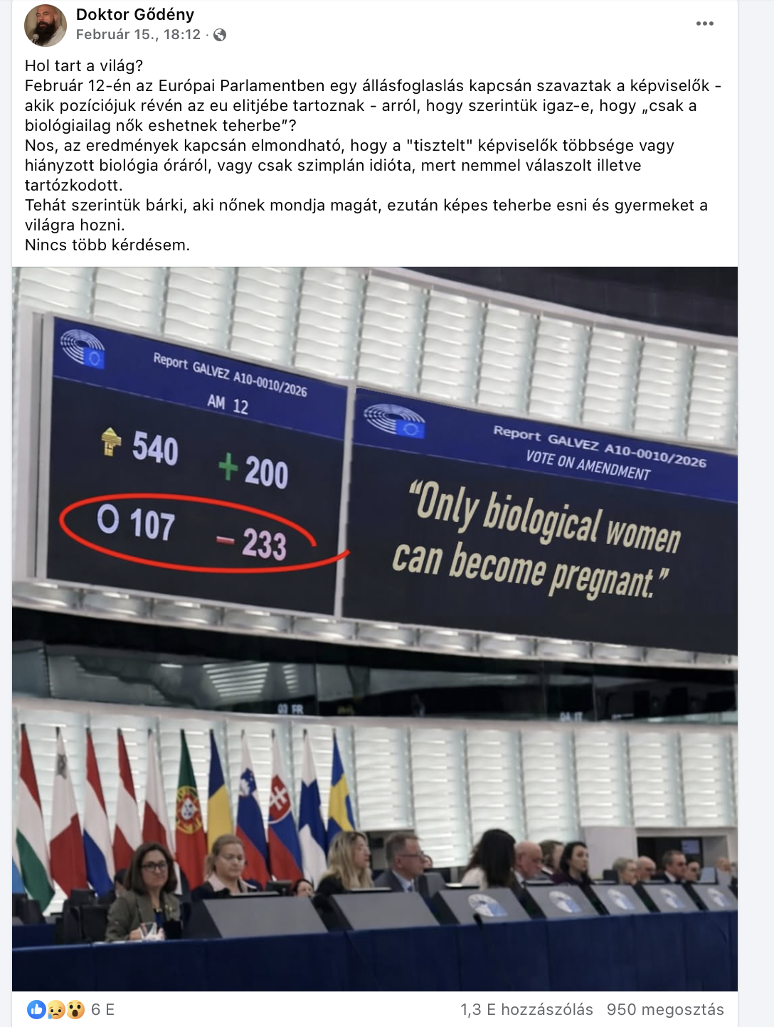 Ez a szöveg szerepel egy Facebookon terjedő kép mellett, amelyen az Európai Parlament (EP) kijelzője és egy szavazás eredménye látható. A tartalmat Gődény György „Doktor Gődény” nevű profilja osztotta meg február 15-én. A képen az „Only biological women can become pregnant” („csak a biológiai nők eshetnek teherbe”) mondat szerepel, rögtön mellette pedig a többségében elutasító szavazás eredménye látható egy kijelzőn. A bejegyzés mintegy 8 ezer reakciót – komment, megosztás, lájk együtt – generált.
