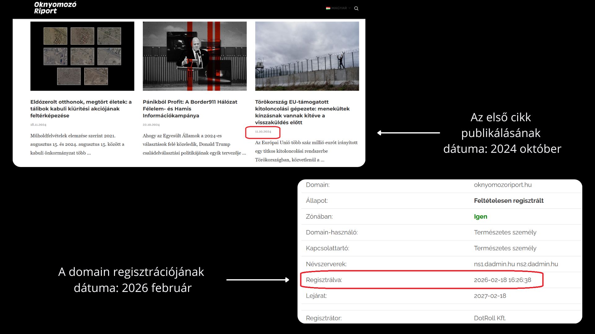 - Az oknyomozoriport.hu-t február 18-án 16:26 perckor jegyezték be – az oldalon megjelent kamucikkeket viszont 2024 októberéig dátumozták vissza.