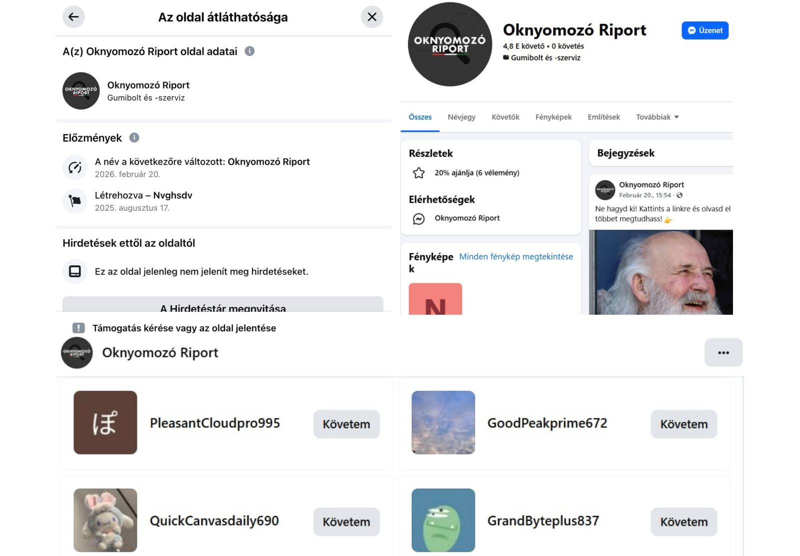 - Egy egyébként 2025 nyarán létrehozott Facebook-oldal nevét szintén február 20-án megváltoztatták Nvghsdv-ről Oknyomozó Riportra. Az oldal azonban továbbra is „Gumibolt és -szerviz” kategóriában maradt. A nagyarányú kamuprofil-gyanús követő arra enged következtetni, hogy mesterségesen pumpálták fel a követőszámot.