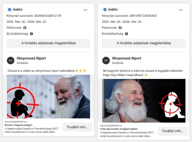 - Ugyanaznap feladtak egy-egy fizetett hirdetést a Facebookon, ezek 4 nap alatt végigfutottak anélkül, hogy a Meta leállította volna őket.