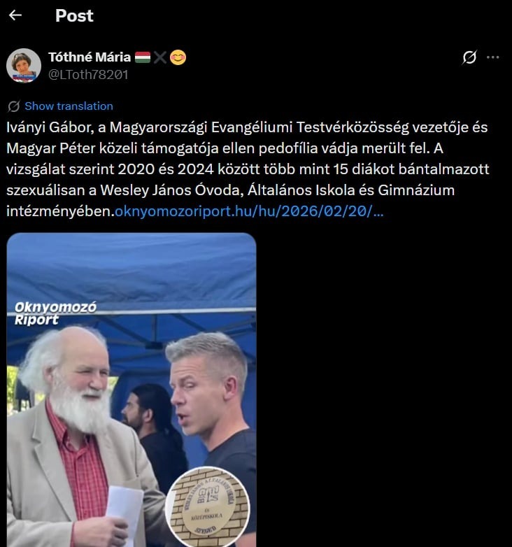 – ezzel a címmel jelent meg egy anyag február 20-án egy rendkívül furcsa oldalon, ami az Oknyomozó Riport nevet viseli. Az angolul és magyarul is publikált írás (archivált link) szerint a MET vezetőjével szemben „súlyos vádakat” fogalmaztak meg a MET által fenntartott intézmények volt diákjai. A cikkben háromszor szerepel, hogy Magyar Péter „közeli támogatója” Iványinak, és „szellemi vezetőként” tekint rá, és a cikk fő illusztrációjaként is Iványi és Magyar közös képét használták.