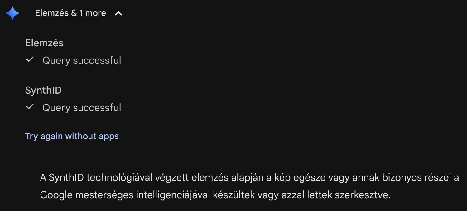 A Google SynthID vízjel-felismerője szerint a kép egésze vagy annak bizonyos részei a Google mesterséges intelligenciájával készültek, vagy azzal lettek szerkesztve.