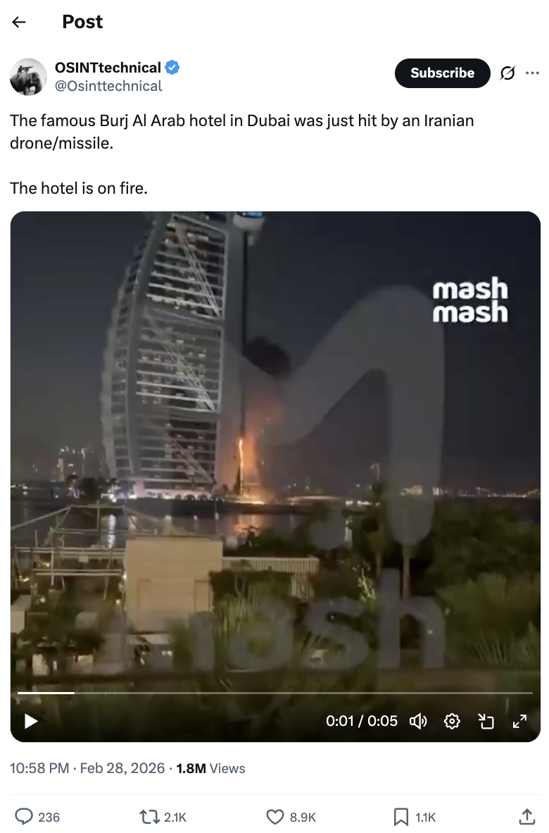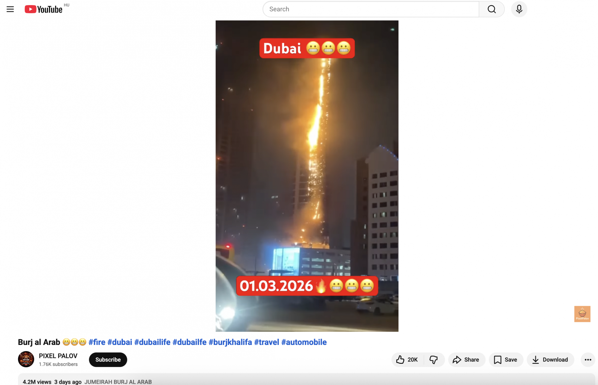 A cikk egy alapvetően számítógépes játékokról posztoló YouTube-csatornára hivatkozik, ahol közzétettek egy videót (ami már nem elérhető) egy lángoló épületről, a leírás szerint a dubaji Burdzs al-Arab luxusszállodáról. A videót több mint 4 millióan látták, a posztolója kommentben jelezte, hogy a felvétel egy nyílt hírforrásból származik és arra kérte a kommentelőket, hogy segítsenek tisztázni, valódi-e.
